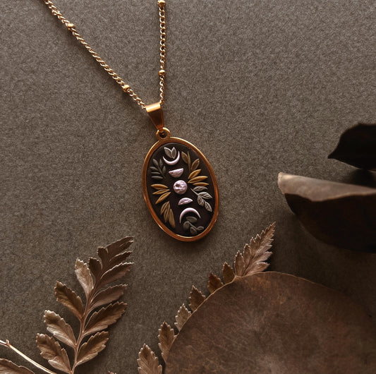 Botanical Moon Phase | Pendant | Necklace | Handmade Polymer Clay | Gold